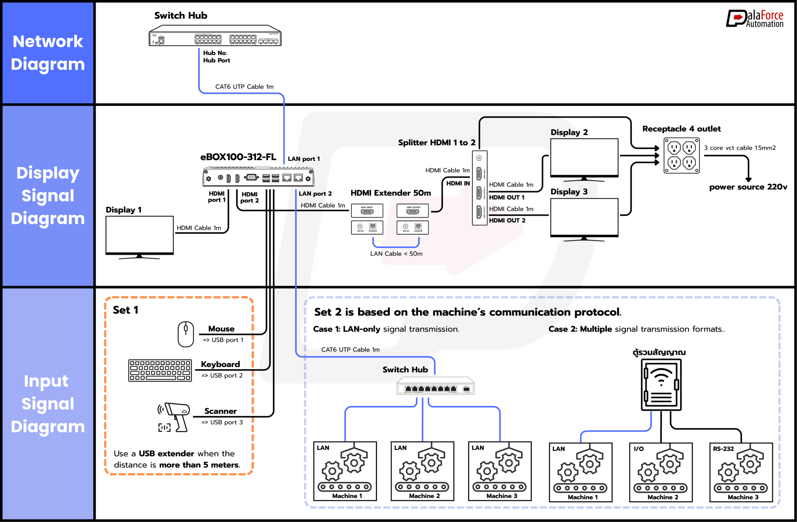 The diagrams help users understand how machine signals, network components, and display interfaces work together to deliver real-time OEE monitoring.